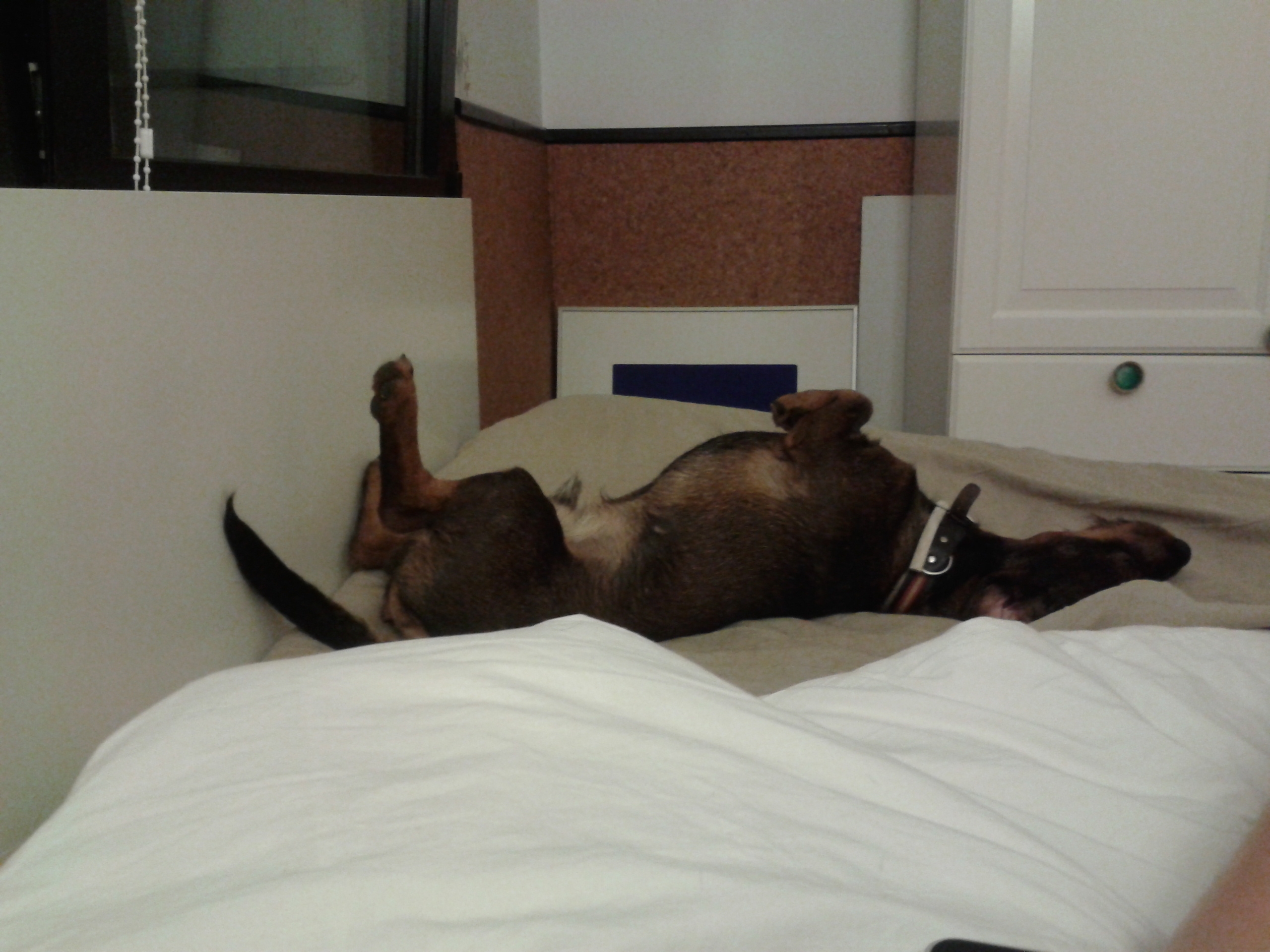 Como no se decidió a tirarse al agua, os enseño a Dragón disfrutando del sueño en la cama de Paula os Cuida
