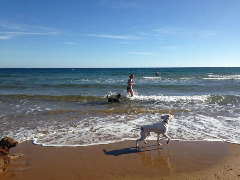 Nos habían dejado a kiwi, un labrador de 14 años que se movía con dificultad, así que cargamos con él hasta la orilla para que disfrutase del golpe de las olas! Le podéis ver a la izquierda de la foto más abajo 😀