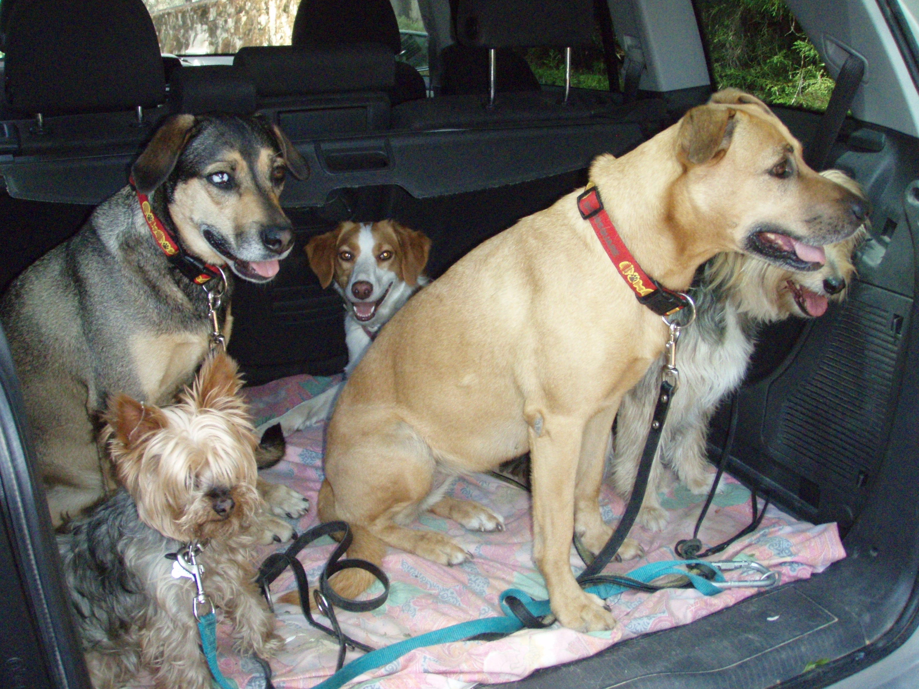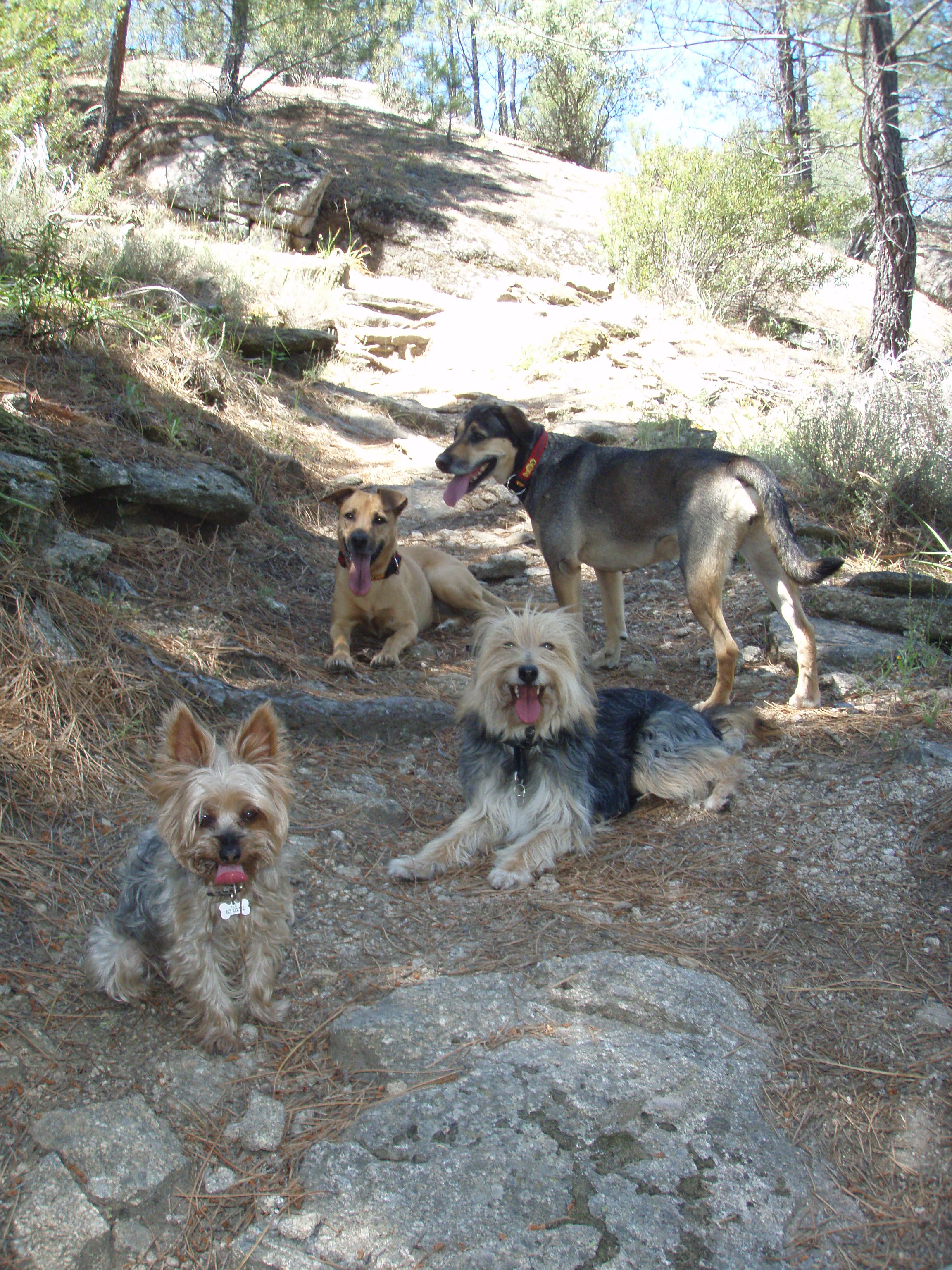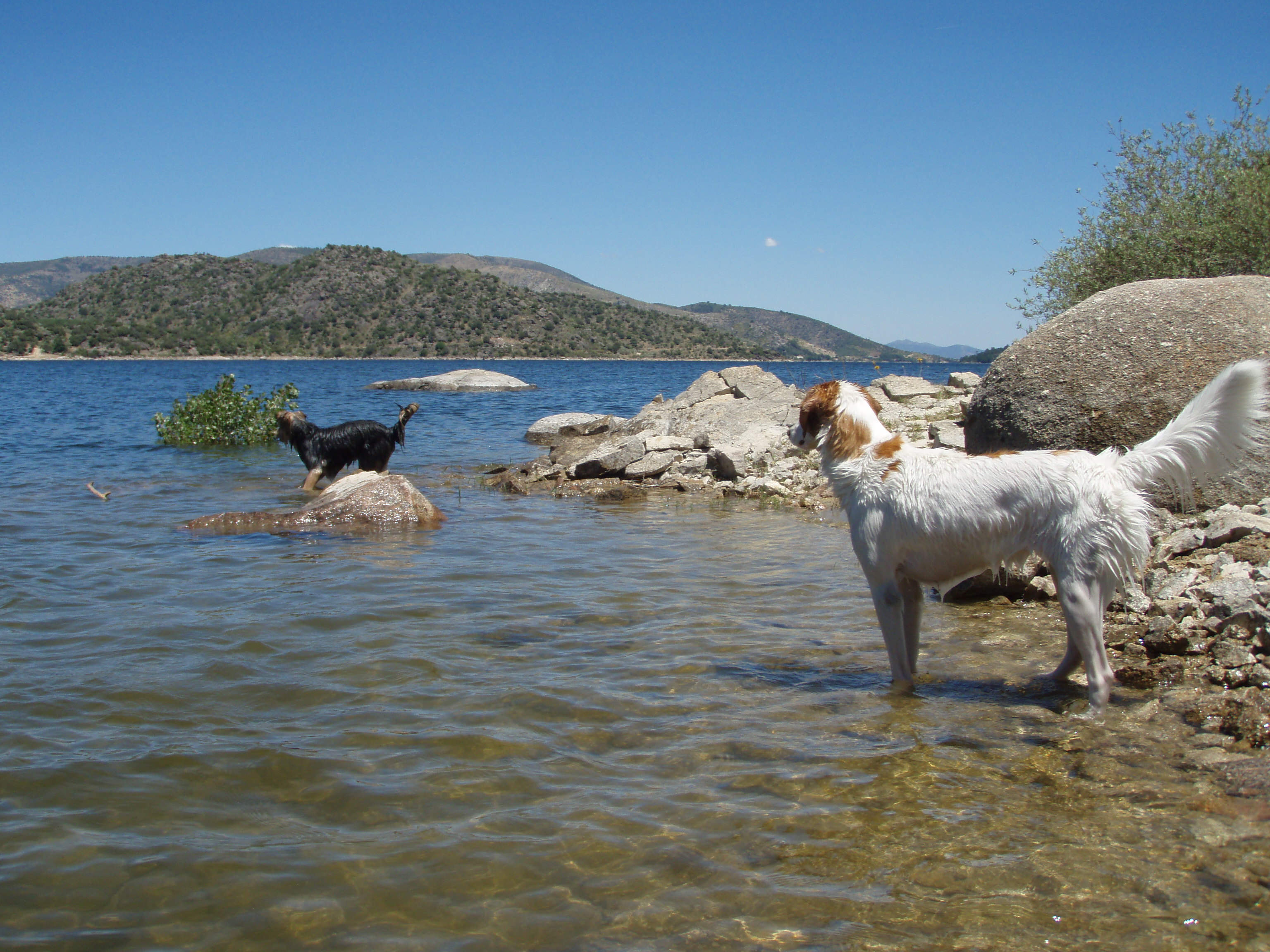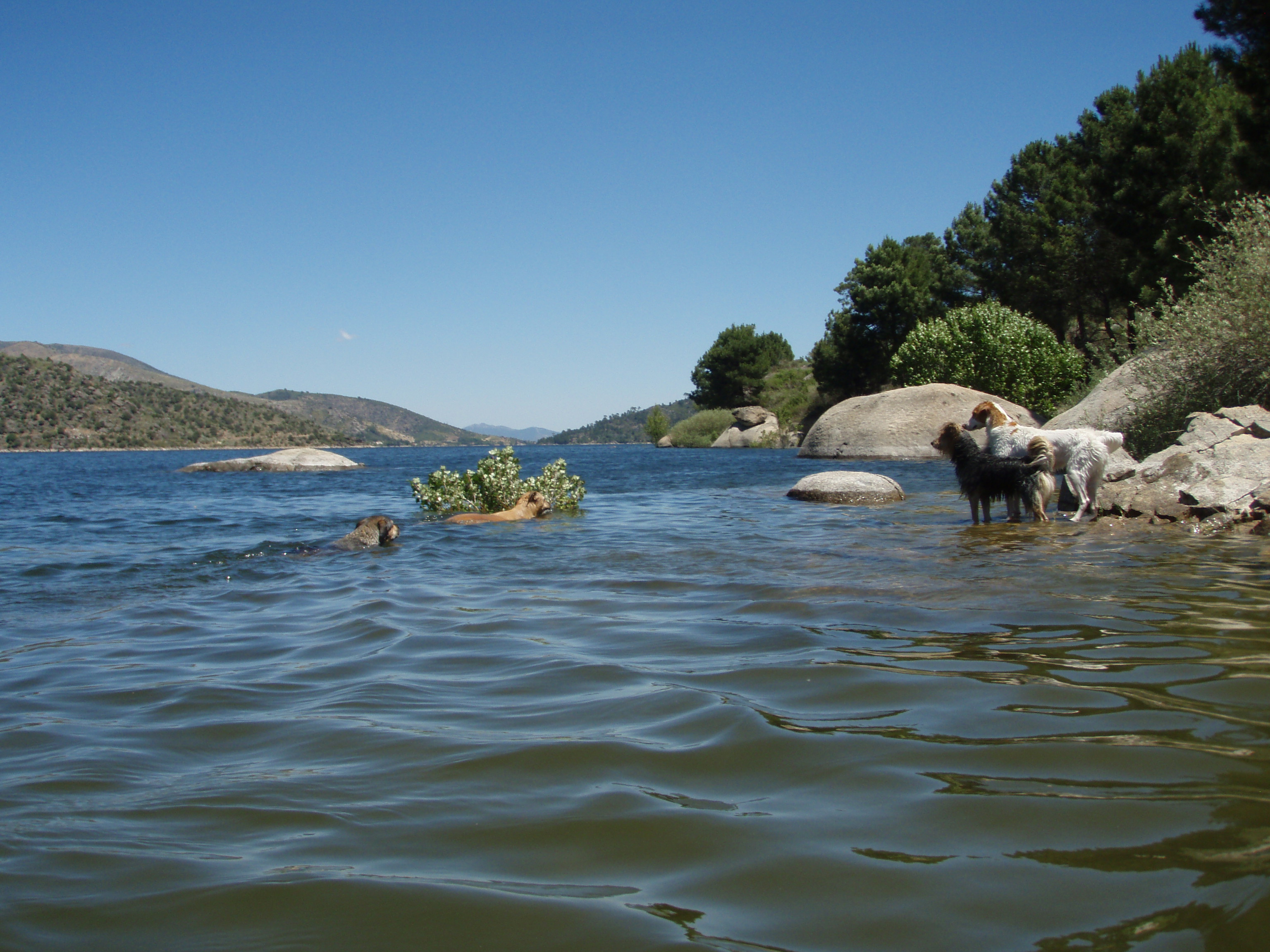 Ahora que llega el verano empezamos con las excursiones para ir a sitios donde bañarnos con los perros. La del domingo fue relativamente cerca de Madrid, en el pantano del Burguillo. Esta es la tropa que llevamos